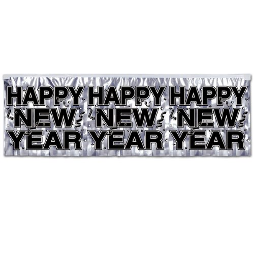 Flame Resistant Metallic Happy New Year Fringe Banner. Color: silver. Printed 1-ply PVC. Size: 14'''' x 4'. 1per package. Made in USA.'' Case Pack 84 Please note: If there is a color/size/type option, the option closest to the image will be shipped (Or you may receive a random color/size/type).